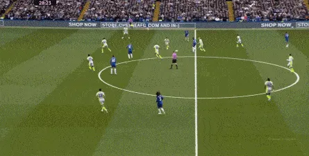 这种情况下,帕尔默和若昂-佩德罗又不能直接从中路打出进攻,也就不能吸引防守重心,从而给边路制造出更大的空间,所以在上半场后半段,切尔西的威胁进攻就变得很少了,这次帕尔默在中路实际失误,但错进错出形成的传中,就是为数不多的机会了: