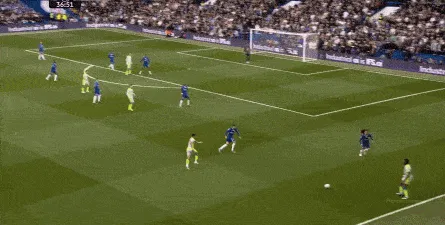 丢球了,切尔西在主场总该有些变化了吧,你不能说没有,这体现在他们的前场逼抢力度稍有提高,但并没有提高到足以干扰曼城后场球员起脚质量的高度,所以曼城反而打出了两次不错的打身后,这就把切尔西又给打回去了: